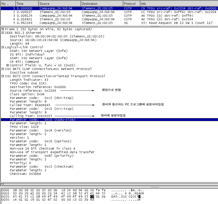 제가 알고싶은것은 Called TSAP가 하는 역활이 무엇인지와 PC에서 CR 패킷을 보낼때 Source Reference 하는 역활이 무엇이며